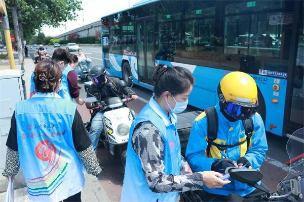 当快递员、外卖员停下等待红灯的时候,志愿者们主动上前,递上宣传资料和免洗洗手液,用通俗易懂的语言讲解手卫生的重要性。为了让新就业群体快速掌握正确洗手方法,工作人员现场示范“六步洗手法”。