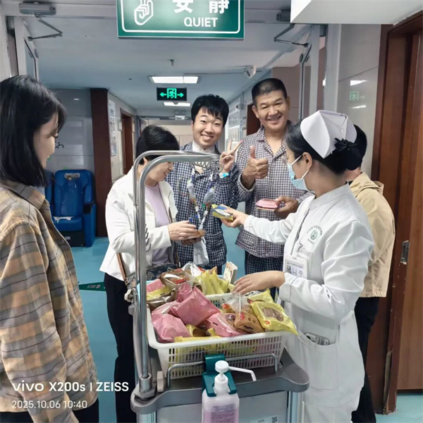 当患者与家属感受节日关怀的同时,医院各科室的值班医护人员也收到了专属慰问。中秋假期,为保障患者诊疗需求,许多医护人员主动放弃与家人团聚的机会,坚守在诊疗、护理一线。