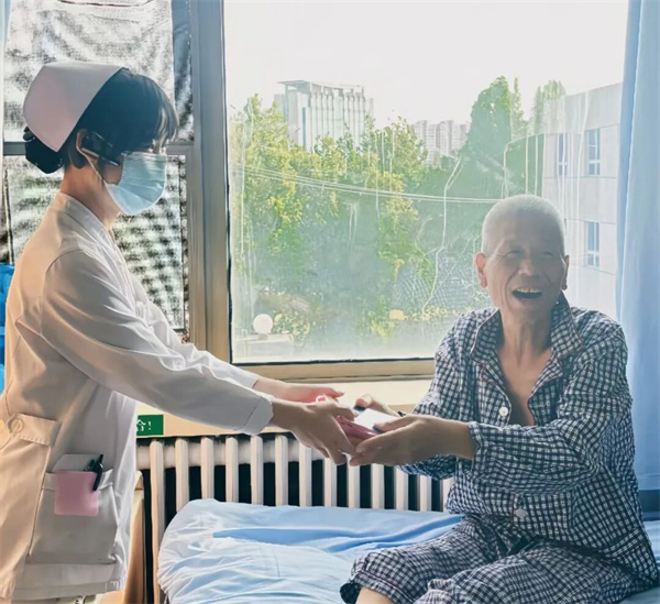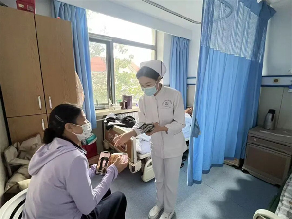 每一份礼盒的传递都伴随着轻声的问候与真挚的祝福。医护人员不仅送上礼物,还耐心询问患者的病情变化、饮食睡眠情况,叮嘱家属注意陪护休息——小小的病房里,月饼的香甜与温情的话语交织,驱散了疾病带来的阴霾,也让中秋的团圆感在医患之间悄然流淌。