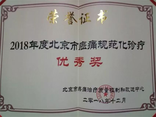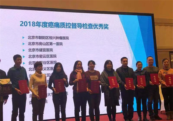 2018年12月20日,北京市疼痛治疗质量控制和改进中心召开北京市癌痛诊疗质控督导检查2018年度总结暨2019年度启动会,全市60余家开展癌痛诊疗业务的二、三级医院及肿瘤专科医院参会。我院凭借在癌痛规范化诊疗中的突出表现与扎实成果,荣获“2018年度北京市癌痛规范化诊疗优秀奖”,进一步印证学科诊疗水平的区域认可度。