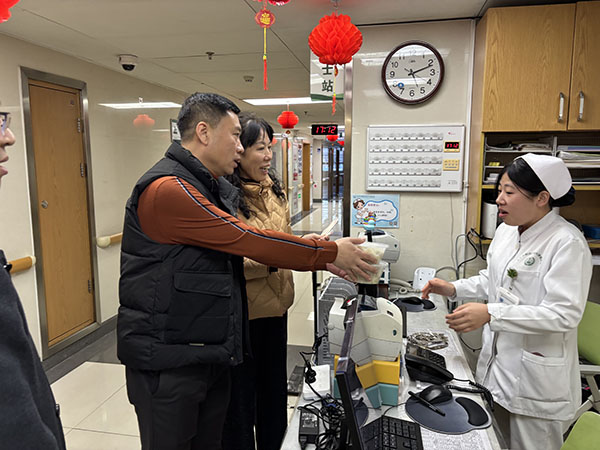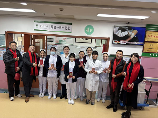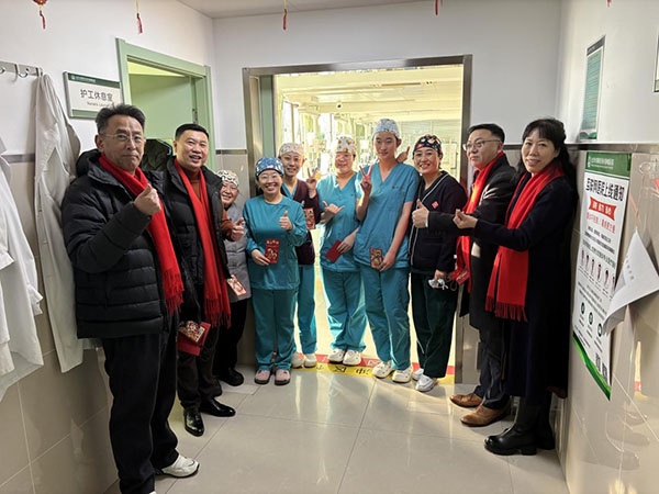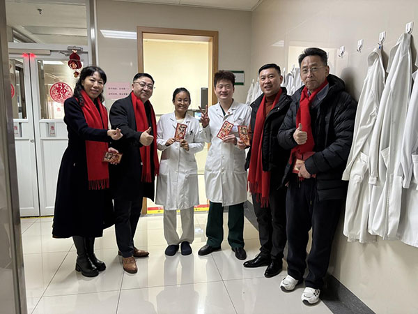 大年初一清晨,年味正浓,医院领导班子再次来到各科室,为节日期间持续值守的医护人员送上新春红包和节日礼品,向大家致以新年的美好祝愿。每到一处,院领导都与值班医护人员亲切握手交流,详细询问节日值班安排、患者诊疗情况,充分肯定大家在新春佳节坚守医疗一线、守护群众健康的责任与担当,反复叮嘱大家在做好医疗服务的同时,也要兼顾自身休息,做好健康防护。“新年好!辛苦了,给大家拜年了!”一句句真挚的问候,一份份满载心意的红包,让坚守岗位的医务人员倍感温暖与鼓舞。