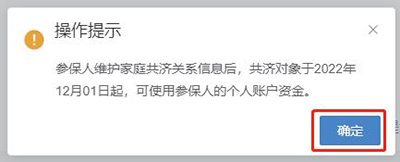 03. 查看【操作提示】:参保人维护家庭共济关系信息后,共济对象于2022年12月01日起,可使用参保人的个人账户资金。点击【确定】按钮。