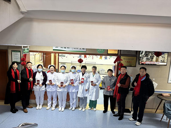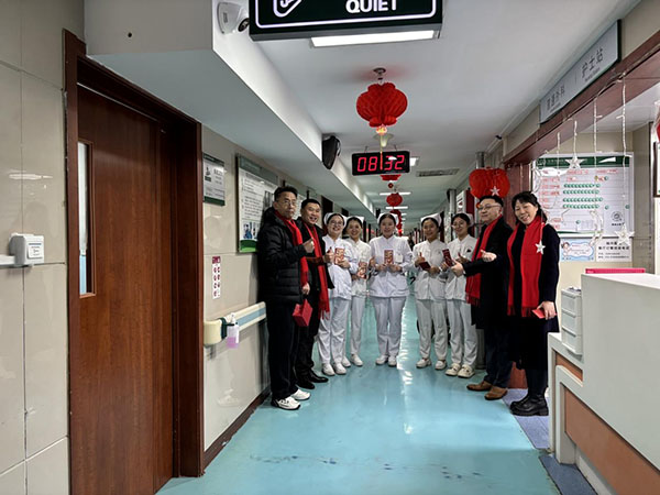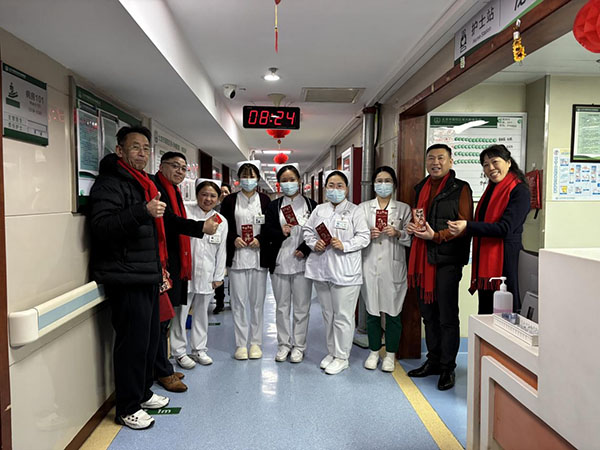 大年初一清晨,年味正浓,医院领导班子再次来到各科室,为节日期间持续值守的医护人员送上新春红包和节日礼品,向大家致以新年的美好祝愿。每到一处,院领导都与值班医护人员亲切握手交流,详细询问节日值班安排、患者诊疗情况,充分肯定大家在新春佳节坚守医疗一线、守护群众健康的责任与担当,反复叮嘱大家在做好医疗服务的同时,也要兼顾自身休息,做好健康防护。“新年好!辛苦了,给大家拜年了!”一句句真挚的问候,一份份满载心意的红包,让坚守岗位的医务人员倍感温暖与鼓舞。
