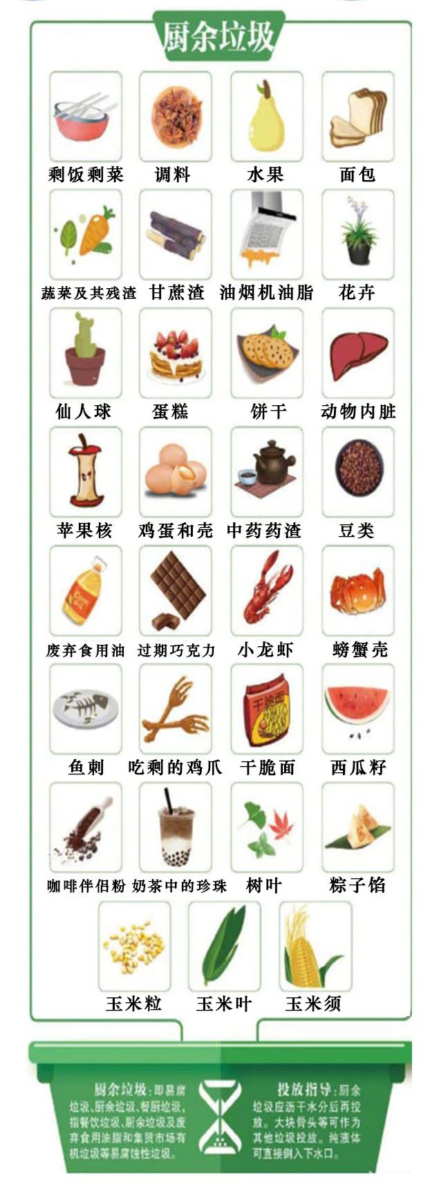 指家庭中产生的菜帮菜叶、瓜果皮核、剩菜剩饭、废弃食物等易腐性垃圾;从事餐饮经企业事业等单位集体食堂在食品加工、饮食服务、单位供餐等活动中产生的食物残渣、食品加工废料和废弃食用油脂;以及农贸市场、农产品批发市场产生的蔬菜瓜果垃圾、腐肉、肉碎骨、水产品、畜禽内脏等。弃食用油脂是指不可再食用的动植物油脂和油水混合物。
